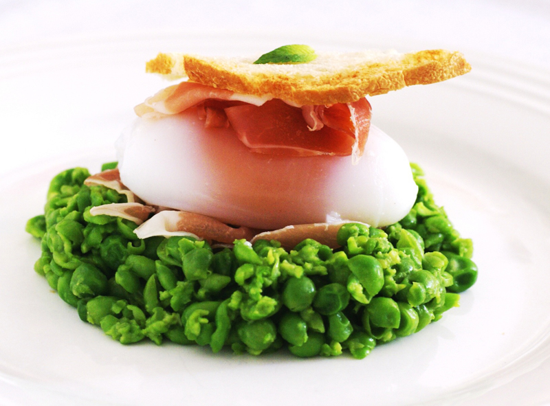 3. To assemble – divide the peas in half and divide onto two plates. Add a slice of prosciutto on each nest and then add the egg. Sprinkle with white pepper and some salt – then add another slice of prosciutto and round it off with a little toast.