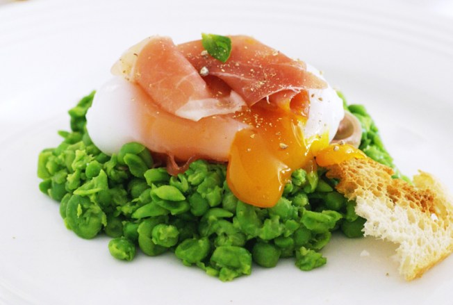 3. To assemble – divide the peas in half and divide onto two plates. Add a slice of prosciutto on each nest and then add the egg. Sprinkle with white pepper and some salt – then add another slice of prosciutto and round it off with a little toast.
